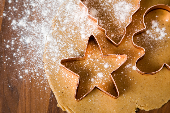 (5) A hűtőből kivéve hagyjuk kicsit felengedni a masszát, majd 4 részre osztjuk. Lisztezett deszkán 3-4 mm vastagságúra nyújtjuk. Tetszés szerinti formákkal kiszúrjuk.