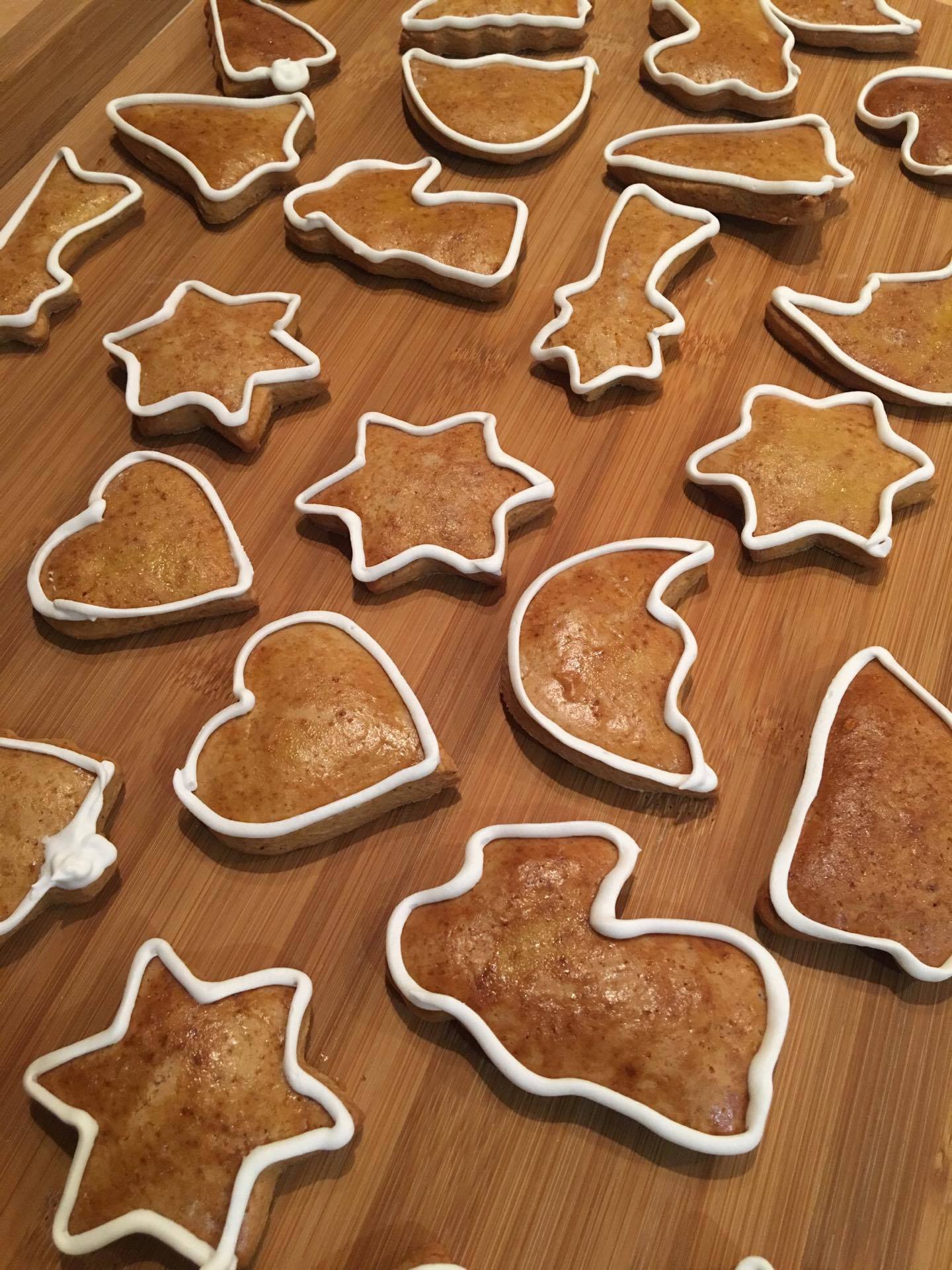 (7) Az írókához a tojásfehérjét a porcukorral és a citromlével 5 percig keverjük robotgéppel, magas fokozaton. Egy nyomózsákba vagy vastagabb zacskóba töltjük, aminek az egyik sarkán vágunk egy egész pici lyukat. A kihűlt mézeskalácsokat ezzel díszítjük.